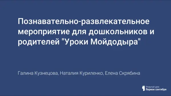 Познавательно-развлекательное мероприятие для дошкольников и родителей «Уроки Мойдодыра» предназначено для детей среднего дошкольного возраста. Данное мероприятие является выходом из педагогического проекта «Уроки Мойдодыра». Основная цель проекта: формирование культурно-гигиенических навыков умывания у детей среднего дошкольного возраста с ЗПР через использование художественной литературы и разных видов деятельности.