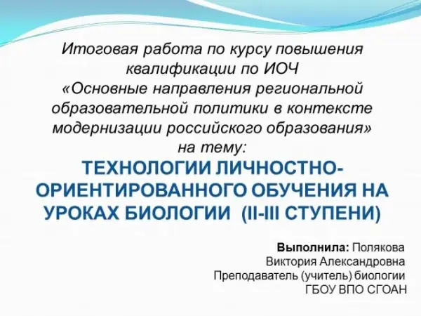Цель работы: рассмотреть технологии личностно ориентированного обучения в контексте их применения на уроках биологии. Задачи: познакомить с основными направлениями технологии личностно ориентированного обучения, показать примеры их применения на уроках биологии и внедрить эти технологии в свою профессиональную деятельность, обеспечивая развитие личности учащихся в ситуации успеха.