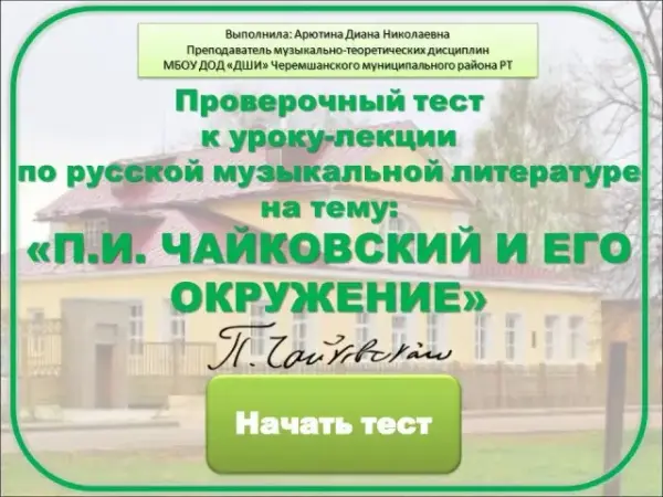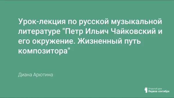 Урок посвящён знакомству с величайшим композитором в истории музыки П.И.Чайковским. П.И.Чайковский самый исполняемый в мире композитор. Он является автором более 80 произведений, в том числе десяти опер и трёх балетов. Его концерты и др. произведения для фортепиано, семь симфоний, четыре сюиты, программная симфоническая музыка, балеты «Лебединое озеро», «Спящая красавица», «Щелкунчик», более 100 романсов представляют ценный вклад в мировую музыкальную культуру.