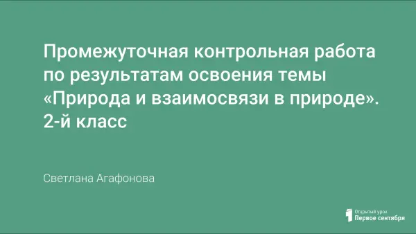 Назначение контрольной работы: оценить уровень освоения каждым учащимся 2 класса содержания по теме “Природа и взаимосвязи в природе”. Вид контроля: итоговый за 1-е полугодие. Содержание контрольных измерительных заданий определяется содержанием рабочей программы по учебному предмету «Окружающий мир» по учебнику для общеобразовательных учреждений «Окружающий мир» А.А.Плешакова. Промежуточная контрольная работа состоит из 10 заданий базового уровня, 3 задания повышенного и 2 высокого уровня сложности. В заданиях использованы иллюстрации из учебника А.А.Плешакова и сети Интернет. Тексты К.Д.Ушинского, из книги «Неизведанное рядом: Занимательные опыты и эксперименты для дошкольников» под редакцией О.В.Дыбина.