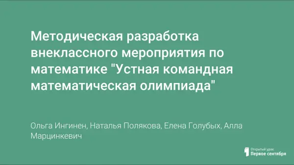 Мероприятие может быть полезным учителям математики, работающим в 5–8-х и 10-х классах. Подбор задач для олимпиады соответствует уровню математической подготовки учащихся данных классов, типы заданий разнообразные, уровень сложности различный. Для каждой задачи приводится решение или ответ, указано время на ее решение и количество баллов.