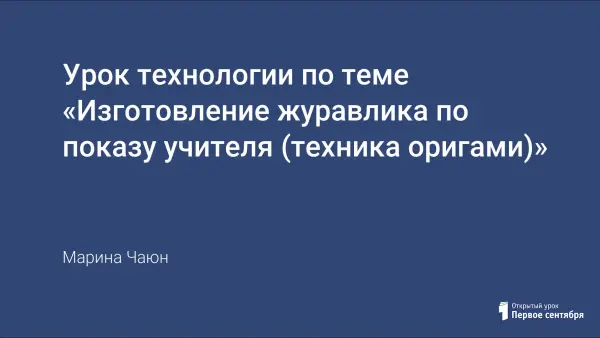 Задачи урока: обучение изготовления журавлика в технике “Оригами”; развитие пространственного мышления, творческого воображения, фантазии, умение работать по инструкции; развитие памяти, внимания в процессе изготовления модели; развитие тонкой мышечной моторики пальцев рук; развитие познавательного интереса к природе через изготовление модели птицы.