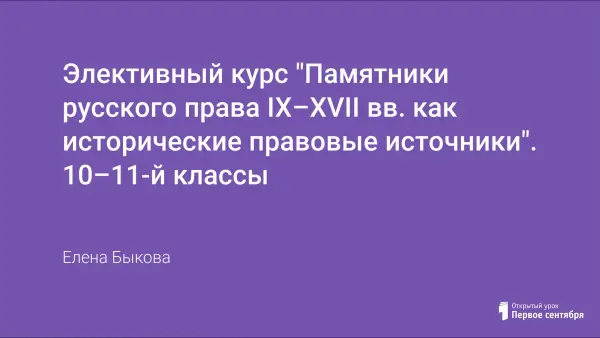 Работа содержит программу элективного курса для учащихся 10–11-х профильных классов. Данный элективный курс дает представление учащимся об особенностях русского права от момента его становления в IX веке до «Соборного Уложения» (XVII в.). Источники древнерусского права в рамках курса истории рассматриваются только в общем, не давая детального объяснения норм древнерусского права. Элективный курс призван сформировать у учащихся более глубокие знания.