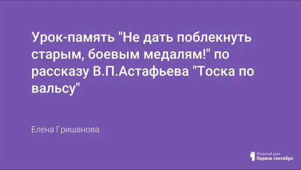 Урок-память по рассказу В.П.Астафьева «Тоска по вальсу» с использованием ИКТ позволяет выявить ключевые проблемы текста и прокомментировать; показывает их актуальность. В основе урока лежит технология РКМЧП, благодаря которой происходит развитие аналитического, критического, ассоциативного мышления; формирование культуры чтения; стимулирование поисковой творческой деятельности учащихся.
