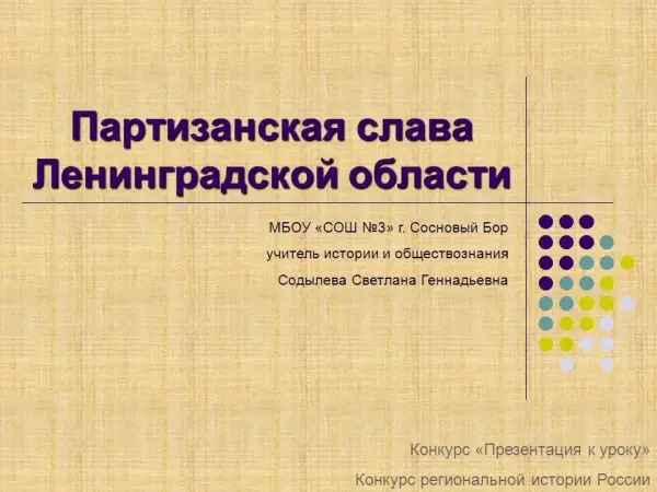 Урок проводится в 10-м классе в рамках курса «История и культура Ленинградской земли». Цель урока – создать представление у учащихся об огромном значении партизанского движения в Ленинградской области. Данный урок может быть использован для проведения тематических классных часов по истории Великой Отечественной войны.