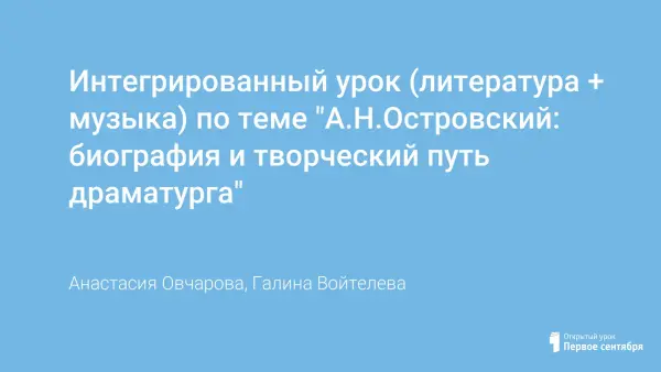 Урок литературы посвящён биографии А.Н.Островского, пьесу которого по программе изучают в 10-м классе. Биографию великого драматурга, следуя логике учебного материала, лучше всего разыграть, то есть задействовать игровые ресурсы личности. Кроме того, интеграция литературного материала с музыкальной составляющей развивает общую культуру учащихся, ориентирует их в пространстве будущей профессии (для средних профессиональных заведений педагогической направленности).