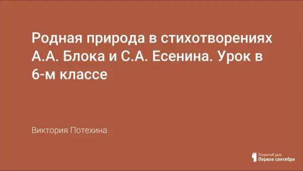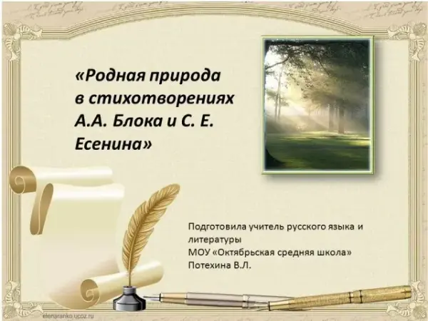 Цель урока: познакомить учащихся с жизнью и творчеством А.А.Блока и С.А.Есенина. Воспитывать любовь к природе. Развивать умение анализировать поэтический текст. Урок построен с опорой на презентацию. Прослушивание музыкальных композиций способствует погружению в творчество поэтов и наилучшему восприятия поэтического текста.