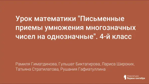 В работе представлен урок математики в 4-м классе по УМК "Школа России". Цель урока: рассмотреть письменные приёмы умножения многозначных чисел на однозначные; совершенствовать вычислительные навыки; развивать умения работать в группах, парах и самостоятельно; совершенствовать умения рассуждать, делать выводы. При подготовке материала к уроку были использованы возможности ПО SmartNotebook10.