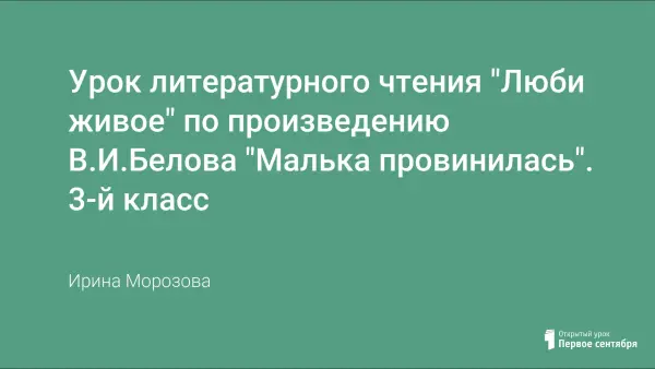 Представленный урок проводится в разделе «Люби живое» и продолжает учить детей литературоведческому анализу на примере произведения В.И. Белова «Малька провинилась". Особое внимание обращается на групповую работу. В результате аналитической работы над текстом учащиеся приходят к выводу, что мы должны заботиться о наших меньших братьях и любить нашу землю.