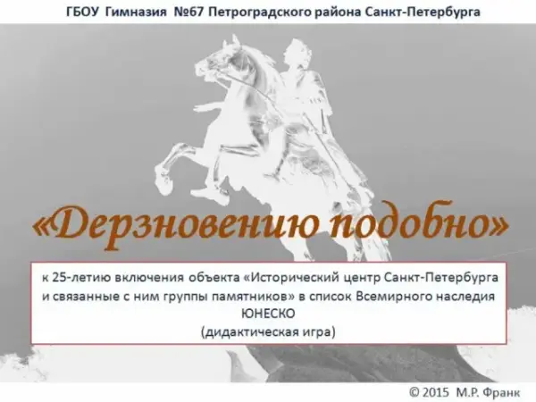 Дидактическая командная игра проведена в рамках уроков наследия, посвященных 25-летию включения объекта «Исторический центр Санкт-Петербурга и связанные с ним группы памятников» в список Всемирного наследия ЮНЕСКО. Цель - создать условия для осмысления школьниками уникальности культурного наследия Санкт-Петербурга, важности его сохранения. Игра имеет «кольцевую» структуру: от информации о Петербурге как объекте всемирного наследия через занимательные вопросы к размышлению о судьбах наследия.