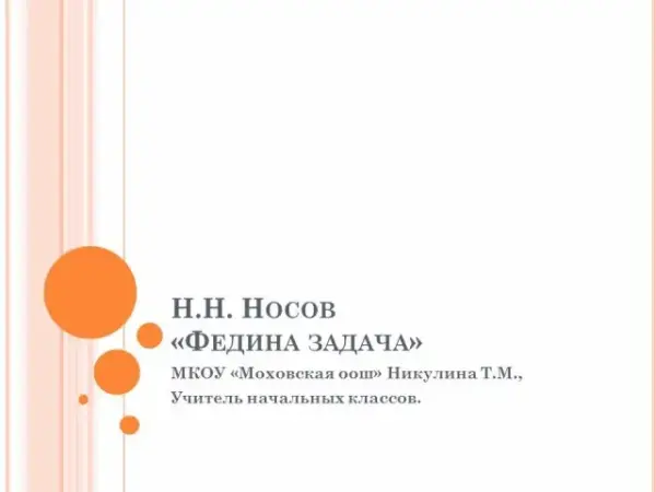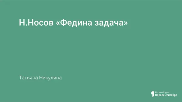 Цель урока: познакомить с рассказом Н.Н.Носова «Федина задача»; развитие умения видеть в юмористических произведениях серьезное и делать выводы. Учиться правильно и выразительно читать и анализировать произведение Н.Н.Носова «Федина задача».