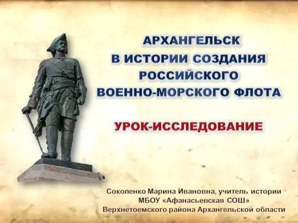 Материалы могут быть использованы не только на уроке истории, но и на внеклассном мероприятии. Занятие проводится в форме коллективного исследования, где учащиеся, жители Архангельской области, находят с помощью различных источников доказательства определяющей роли города Архангельска в создании регулярного военного морского флота в России при Петре I.