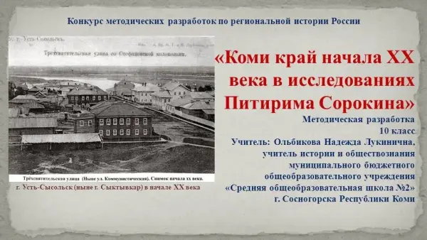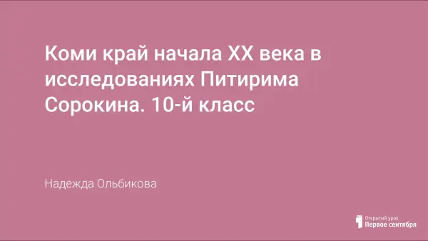 Цель урока: показать особенности развития Коми края в начале XX века на основе этнографических исследований и автобиографии выдающегося русско-американского социолога и культуролога XX века, уроженца коми земли Сорокина П.А. в исследовании истории Коми края.