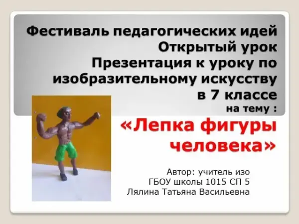 Цель урока: научиться лепить фигуру человека с помощью пластичного материала, с учетом пропорций, передавать объем тела, позу, характер. Урок знакомит учащихся с жанром изобразительного искусства - скульптурой, видами скульптуры, закрепляет художественно-технические навыки лепки фигуры человека, развивает творческое воображение, память умение анализировать пропорциональные отношения, развитие моторно-двигательной координации руки, содействует воспитанию личности.