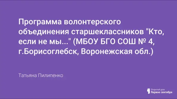 Волонтерское движение может выступить в качестве ведущего метода профилактики асоциального поведения и детской безнадзорности, усилить сопротивляемость личности негативным влияниям среды, формировать у подрастающего поколения навыки социальной и личностной компетентности. Программа волонтерского объединения старшеклассников «Кто, если не мы…» МБОУ БГО СОШ № 4 (г.Борисоглебск, Воронежская обл.) реализуется с 1 сентября 2015 года.