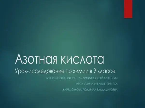 Цели и задачи урока: изучить физические и химические (общие с другими кислотами и особые) свойства азотной кислоты, рассмотреть области применения, научиться составлять уравнения реакций, отражающие химические свойства азотной кислоты. Урок включает выполнение тестового задания, лабораторной работы, демонстрационный эксперимент, конкурса «Своя игра».
