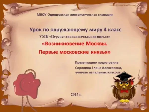 Цели и задачи урока: совершенствование знаний учащихся по теме "Страницы истории Отечества" (Древняя Русь IX–XVI вв.); знакомство учащихся с новой для них информацией о первых московских князьях и их роли в усилении Московского княжества; повторить ранее изученный материал: год основания Москвы, имя основателя Москвы, историю развития Кремля.