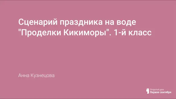 Сценарий праздника на воде для учащихся 1-х классов проводится с целью популяризации спортивно-массовой работы в школе, развития физических качеств, формирование потребности в здоровом образе жизни. Место проведения: школьный бассейн. Участники: учащиеся 1-х классов – две команды по семь человек. В ходе мероприятия дети выполняют различные упражнения, направленные на развитие двигательных навыков, командного духа, воли к победе.