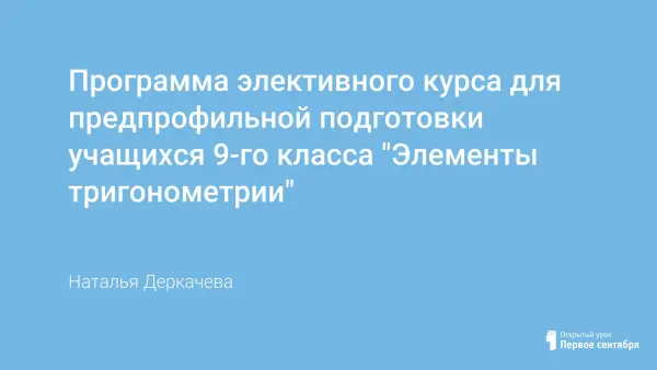 Данная программа предназначена для предпрофильной подготовки учащихся 9-х классов. Содержание курса позволит учащимся расширить знания о тригонометрических функциях; научить решать простейшие тригонометрические уравнения на единичной окружности; развивать коммуникативные навыки в процессе практической работы; приобщить учащихся к работе с первоисточниками для написания сообщений и рефератов. Программа курса является пропедевтикой раздела "Тригонометрия" в курсе "Алгебра и начала анализа 10–11-е классы".