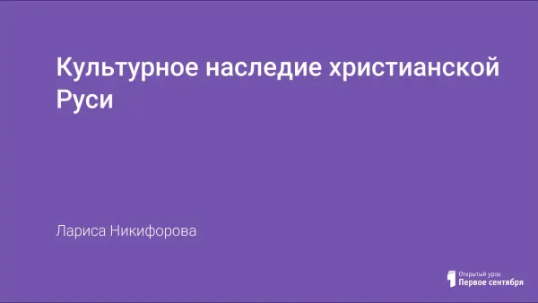 Цель урока: развитие целостного представления о культурном наследии христианской Руси. Задачи урока: актуализировать и расширить знания, понятия и представления учащихся о значении христианства в развитии культуры нашей страны; создавать условия для развития представлений школьника том, как религия способствует укреплению семьи и общества.