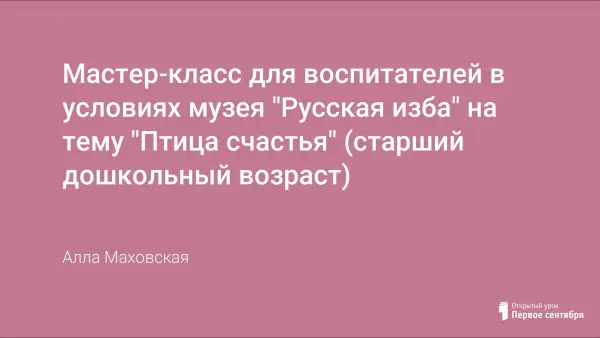 Цель мастер-класса: показать педагогам преимущества условий музея при проведении занятий по патриотическому воспитанию детей. Помочь увидеть, как обстановка музея средствами яркой образности и наглядности обеспечивает детям особый комплекс ощущений и эмоциональных переживаний, вводит детей в мир русского народного быта, где ребенок может максимально самореализоваться. Побудить воспитателей чаще проводить занятия в «Русской избе».