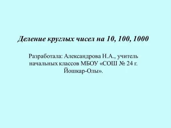 Данный урок математики является комбинированным, включает в себя знания из области математики и окружающего мира, открывает для детей новые знания. Главная цель урока - отрабатывание навыков деления многозначных круглых чисел на 10, 100, 1000, используя алгоритм действий.