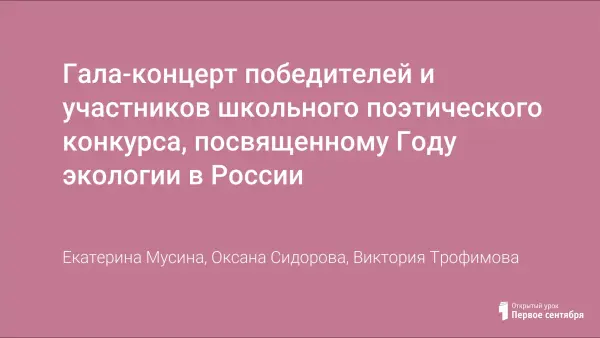 Цель занятия: повышения качества дошкольного образования, развития творческого потенциала детей дошкольного возраста средствами художественной литературы. Задачи: выявить наиболее талантливых юных исполнителей поэтических произведений о природе; приобщить детей к литературному наследию, формировать экологическую культуру посредством позитивных образов природы, отраженных в литературных произведениях; активизировать творческий семейный потенциал в решении экологических проблем.