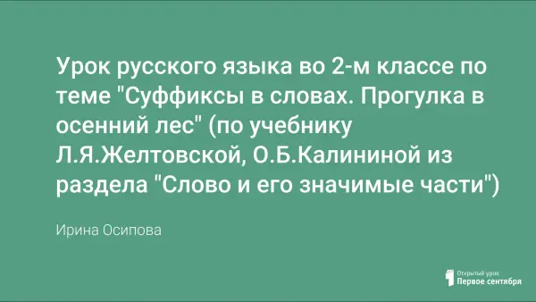 Урок по теме «Суффиксы в словах» - третий в разделе «Слово и его значимые части». Дети изучили темы «Корень», «Однокоренные слова». Этот урок проходит осенью, наступает в природе грибная пора, актуально совершить прогулку в лес. Материал урока представлен в виде презентации «Прогулка в осенний лес». Урок разработан для открытия новых знаний по теме «Суффикс – значимая часть слова».