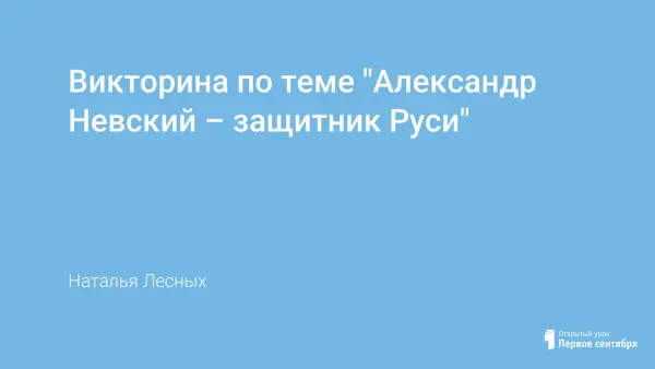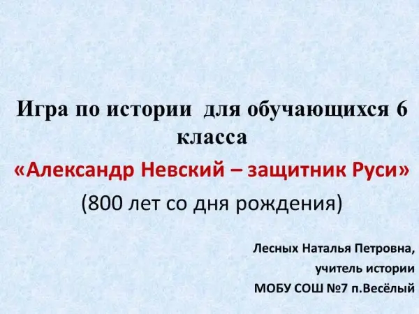 Представлена презентация к игре-викторине по истории для обучающихся 6-го класса, посвященной 800-летию со дня рождения Александра Невского.