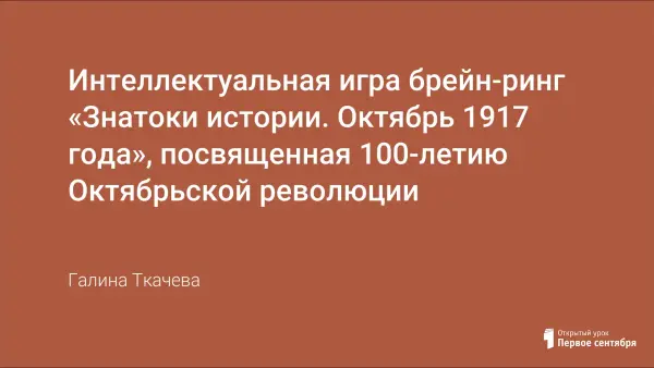 Цель представленного материала: познакомить с основными правилами подготовки (положение о проведении интеллектуальной игры брейн-ринг «Знатоки истории. Октябрь 1917 года» и проведение брейн-ринга (сценарий, судейство). Данную разработку, подготовленную на основе опыта работы, можно использовать в кружковой и внеклассной работе, дополнительном образовании детей.