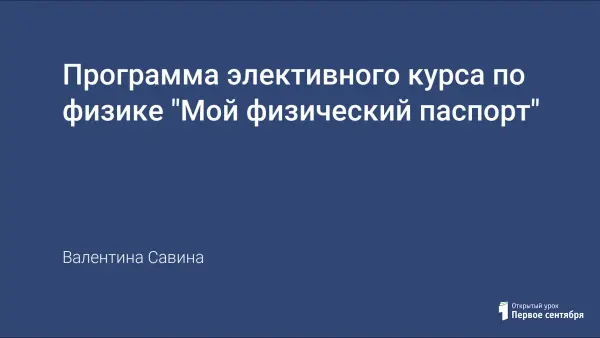 Программа курса предусматривает разработку и презентацию образовательного продукта – "физического паспорта" школьника. Освоение программы курса позволит учащимся познакомиться с физическими параметрами человека и его эргометрией, формировать навыки исследовательской деятельности, научиться работать со справочной и научно-популярной литературой, оформлять проект.
