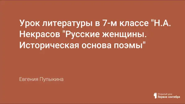 Урок литературы по поэме Н.А.Некрасова «Русские женщины» призван познакомить с исторической основой поэмы «Русские женщины», раскрыть величие, красоту души героинь поэмы – Трубецкой и Волконской, показать широту проблематики поэмы, способствовать развитию аналитического и выразительного чтения, построению логических высказываний.