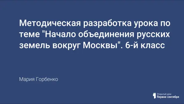 Урок в 6-м классе призван раскрыть предпосылки и причины объединения русских земель в единое государство, сформировать представление о политической системе Руси в XIV в., определить причины возвышения Москвы и превращения её в центр объединения Руси, уяснить, что главной причиной этого являлась рациональная политика московских князей; направлен на формирование научного мировоззрения, нравственных качеств, развитие познавательного интереса, творческих способностей.