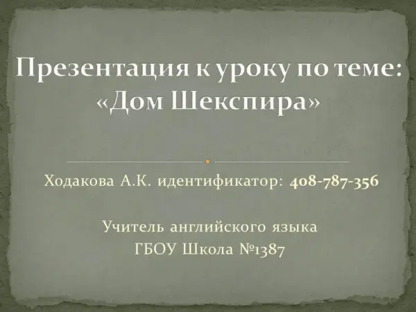 В статье рассмотрены особенности развития социокультурной компетенции на примере проведения открытого урока по теме «Дом Шекспира». Работа раскрывает значимость межкультурного компонента при обучении иностранному языку в начальной школе. В ходе урока интегрированы работа по УМК Family and Friends 1 (юнит «Мой дом») и опыт знакомства с общей информацией биографии У.Шекспира. К сценарию подготовлена презентация.