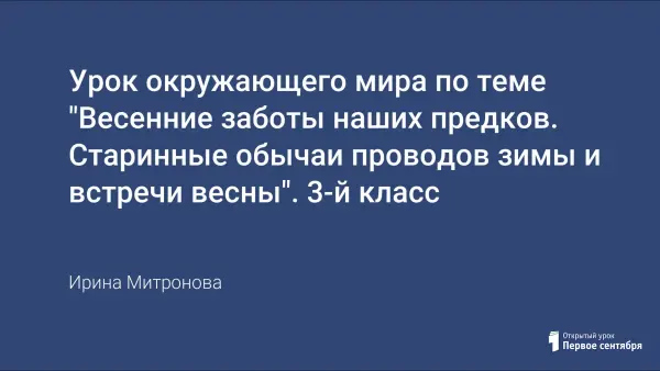 Урок изучения нового материала в 3-м классе (УМК "Гармония") направлен на знакомство детей с обычаями проводов зимы и встречи весны у русского народа, призван продолжить обучение умению наблюдать, анализировать, проверить умение выделять признаки весны в неживой и живой природе, воспитывать уважение к народным ценностям, к родной земле, любовь к родному краю.