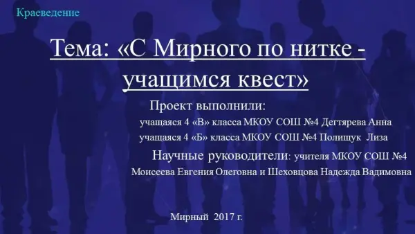 История г.Мирного является неотъемлемой частью космодрома «Плесецк». Нельзя представить город без космодрома или наоборот. Это единая большая семья со радостями и горестями, с маленькими делами и важными мероприятиями, с детьми и стариками, с военным прошлым и современным будущим. С годами дети меньше интересуются своими корнями. Но и у этой истории есть интересные моменты и загадочные факты, поэтому с историей города учащиеся познакомятся с помощью игры-квеста.