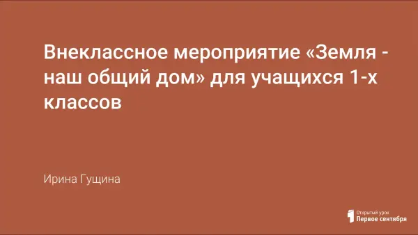 Внеклассное мероприятие предназначено для учащихся 1-го класса. Цель: воспитывать любовь и бережное отношение к Земле как к общему дому для всего живого. Задачи: формировать экологическое сознание и чувство уважения к планете Земля; вывести правила поведения на природе на основе художественных произведений; воспитывать бережное отношение к природе и желание взаимодействовать с природой; развивать интерес и любовь к окружающему миру.