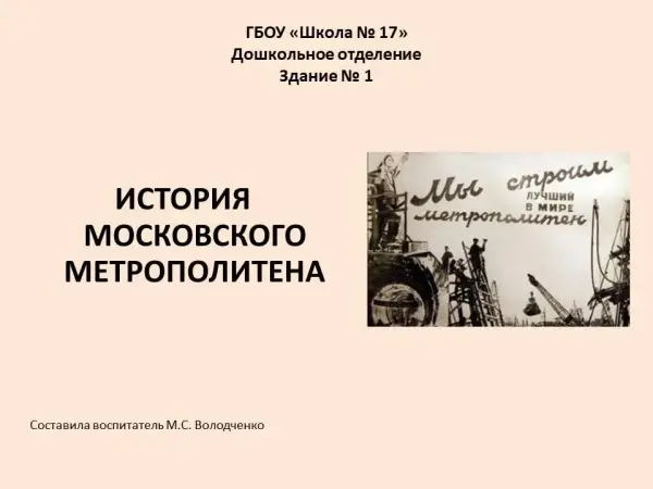 Данная презентация предназначена для дошкольников 6–-7 лет и может быть использована в рамках познавательного развития при изучении достопримечательностей г. Москвы. Презентация дает детям представление о строительстве и развитии Московского метрополитена, способствует воспитанию патриотических чувств, речевому развитию и обогащению словаря.