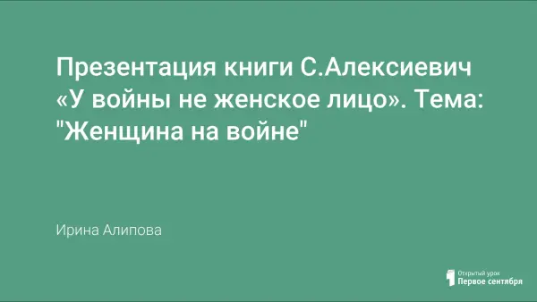 Цели и задачи урока: познакомить с созданием книги; показать правду о героизме и мужестве женщин на войне; способствовать творческому осмыслению произведения; воспитывать человечность в человеке на примерах героинь книги С.Алексиевич «У войны не женское лицо».