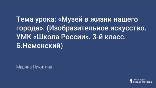 Ученики познакомятся с назначением музеев в жизни человека, ориентируясь на ценности, имеющие национальное и общечеловеческое значение; получат представление о крупнейших художественных музеях России. Наблюдательность и творческое воображение помогут расширить представление о музейном пространстве.