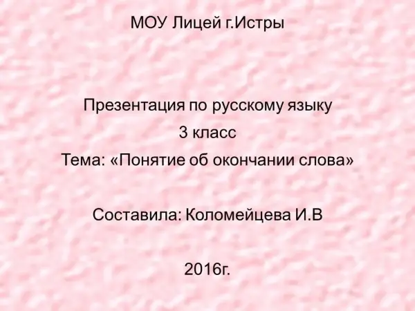 Представленный материал – это первый урок, который знакомит детей с окончанием. Урок можно использовать при работе по всем системам учебников, так как учебный материал конспекта не привязан к материалам конкретного учебника. Урок соответствует требованиям ФГОС. В его основе – системно-деятельностный подход и проблемные методы обучения. Цель урока: познакомить учащихся с окончанием, как изменяемой частью слова и его ролью в предложении.