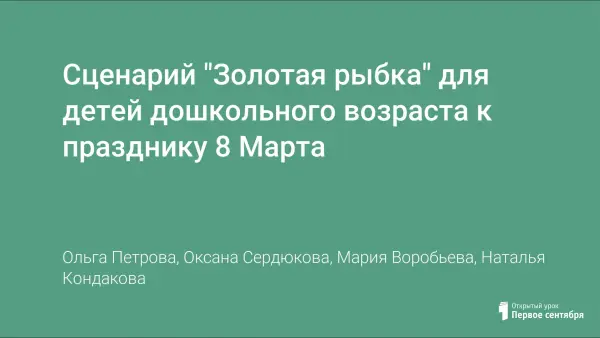 Для воспитателей важно к Международному женскому дню организовать мероприятие, которое будет ярким, запоминающимся, позитивным, чтобы было в радость и детям, и родителям. Форма мероприятия – мюзикл. Эта сказочная история о том, как Сестрица Аленушка и братец Иванушка путешествуют по сказкам и встречаются со сказочными героями, чтобы найти подарок для мамы к весеннему празднику – Золотую Рыбку, которая будет исполнять все мамины желания. Но, оказывается, не надо было так далеко ходить…