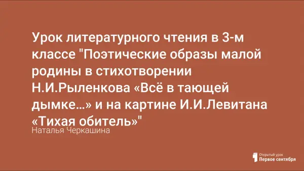 Урок литературного чтения в 3-м классе по теме «Поэтические образы малой родины в стихотворении Н.И.Рыленкова «Всё в тающей дымке…» и на картине И.И.Левитана «Тихая обитель» воспитывает в третьеклассниках чувство понимания красоты родной природы и бережного трепетного к ней отношения; формирует чувства патриотизма, любви к родному краю, к России.