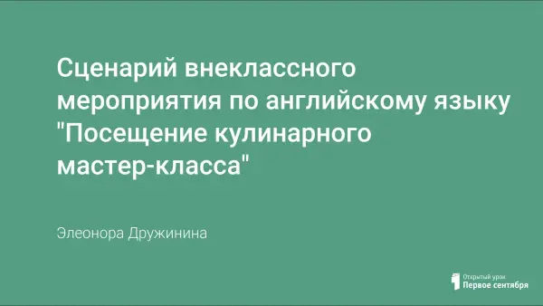 Сценарий внеклассного мероприятия "Посещение кулинарного мастер-класса" был разработан для участия в проведении городского мероприятия «Создание атмосферы, способствующей погружению в тему урока, с помощью декораций, образов и кейс-методов» в рамках экспериментальной площадки «Опорная школа». Данный сценарий внеклассного мероприятия предназначен для преподавателей английского языка, использующих современный подход к обучению иностранным языкам. Целью данного мероприятия является развитие у школьников среднего звена умений и навыков говорения, расширение кругозора, мотивации изучения иностранного языка в школе. В ходе мероприятия обучающимся предоставляется возможность самостоятельного и творческого использования результатов обучения в самых разнообразных условиях игры, а также возможность быть активными участниками учебного процесса.