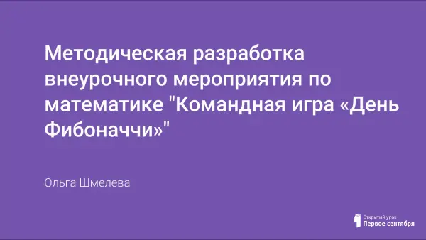 Внеурочное мероприятие для учеников 5-го класса, посвященное Дню Фибоначчи. Цели игры: расширение кругозора, развитие математических способностей, мыслительной деятельности учащихся; развитие творческих способностей и коммуникативных навыков. Ребята класса делятся на две команды, каждой заранее нужно придумать название, девиз, эмблему, подготовить ответы на вопросы викторины, создать презентацию, с информацией о людях, событиях, связанных с Л.Фибоначчи.