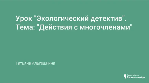 Урок по теме «Экологический детектив. Действия с многочленами» разработан и проведен в 7-м классе. Цель урока: формирование активной позиции в области охраны окружающей среды, закрепление знаний и умений по теме «Действия с многочленами». Урок проходит в виде игры трех команд. В течение урока в ходе выполнения математических заданий дети знакомятся с особо охраняемыми природными объектами Чувашской Республики.