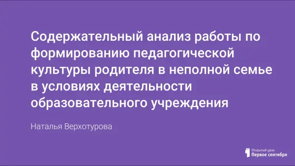 В данной статье раскрывается содержание работы по формированию педагогической культуры родителя в неполной семье. Для этого была разработана и реализована программа деятельности образовательного учреждения, которая предполагала изучение, коррекцию и совершенствование педагогической культуры родителей в неполных семьях.