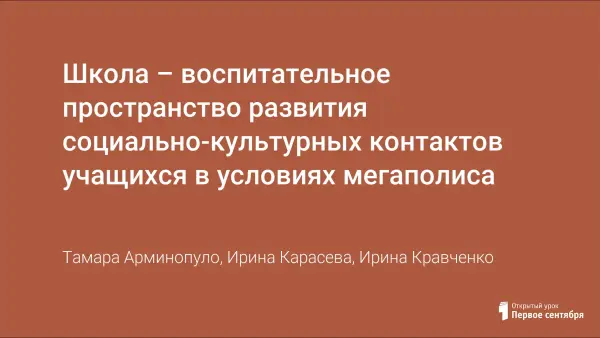 Перед школой, действующей в условиях мегаполиса, стоит сложная задача - уменьшить воздействие «минусов» большого города: роста агрессии, равнодушия, подмены истинных ценностей кратковременными «модными» увлечениями. Необходимо также использовать предлагаемые городом «плюсы» для духовно-нравственного развития личности: формирования культурного кругозора, широких возможностей обучения и самообучения.