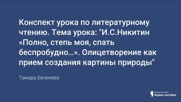 Цель урока: познакомить учащихся с творческой манерой поэта И.С.Никитина на примере стихотворением "Полно, степь моя, спать беспробудно …"; обобщить знания детей по творчеству Ф.Тютчева, И.Никитина, А.Фета; обучать учащихся поэтической речи, чуткому отношению к слову, учить понимать настроение, мысли поэтов; воспитывать чувство прекрасного, потребность в чтении поэзии, прививать любовь к природе.