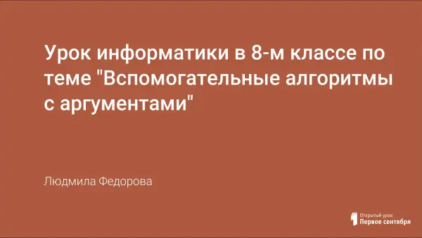 На этом уроке учащиеся учатся решать задачи, используя вспомогательные алгоритмы с аргументами.